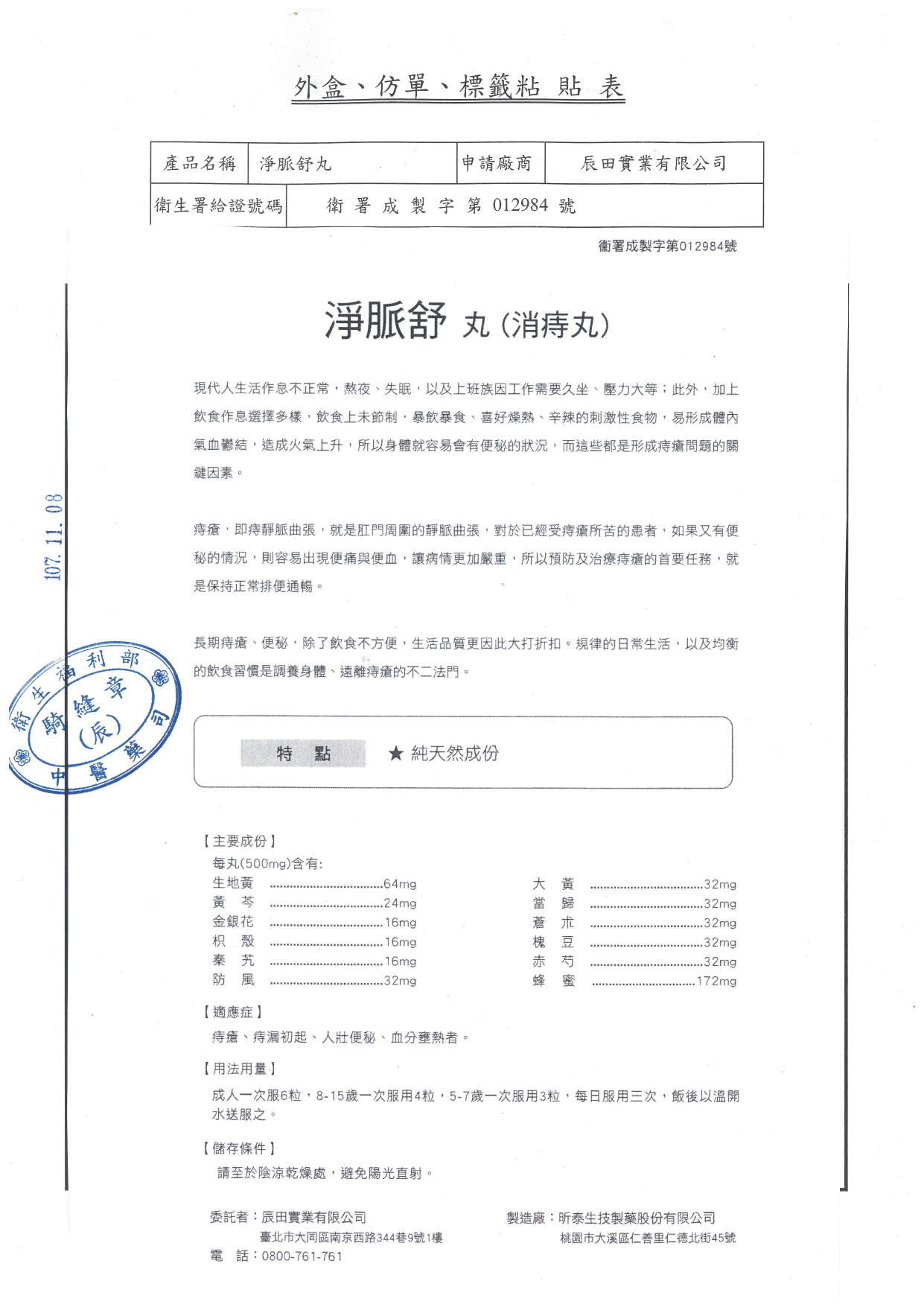 【主成分】生地黃64mg、黃芩24mg、金銀花16mg、积殼16mg、秦节16mg、防風32mg、大黃32mg、當歸32mg、蒼术32mg、槐豆32mg、赤芍32mg、蜂蜜172mg