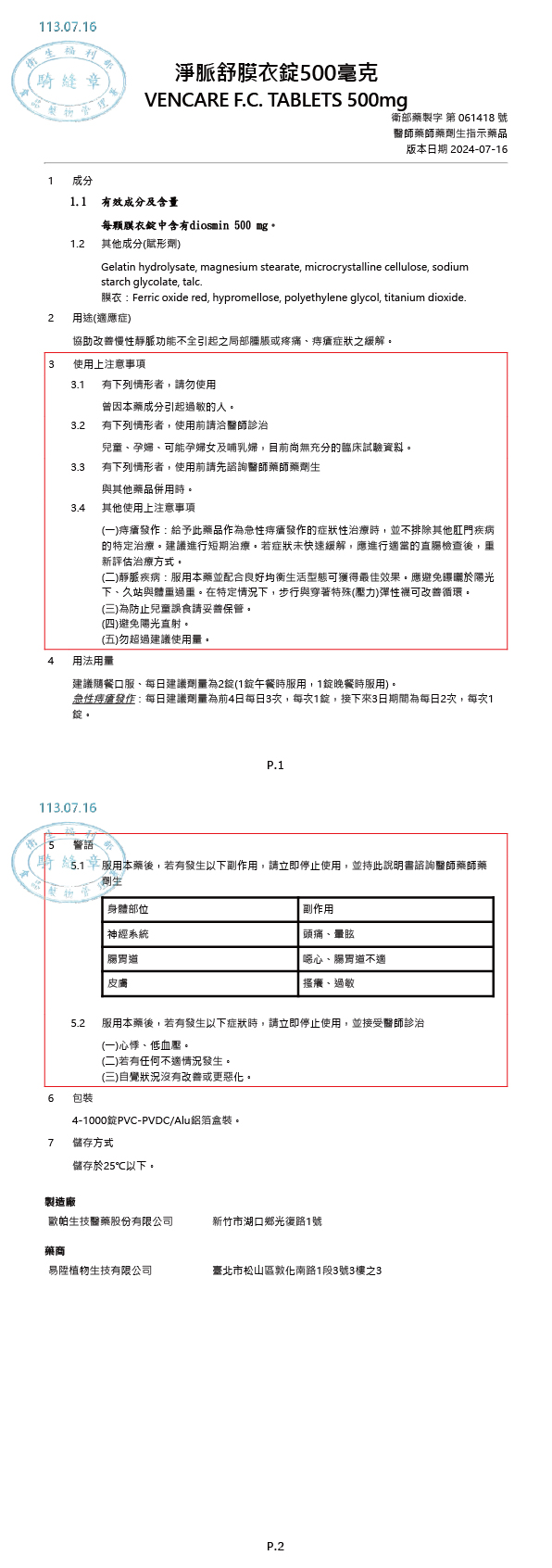 (二)靜脈疾病:服用本藥並配合良好均衡生活型態可獲得最佳效果。應避免曝曬於陽光下、久站與體重過重。在特定情況下,步行與穿著特殊(壓力)彈性襪可改善循環。