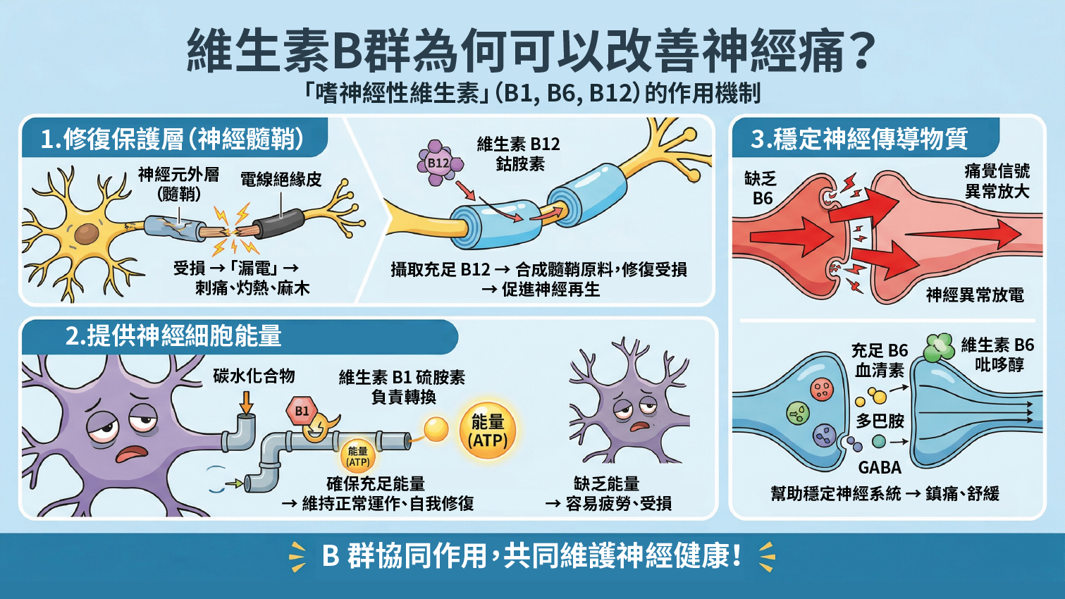 維生素B群(特別是 B1、B6、B12)在醫學上常被稱為「嗜神經性維生素」。這三種維生素在神經系統的運作、修復與再生中扮演著不可或缺的角色。