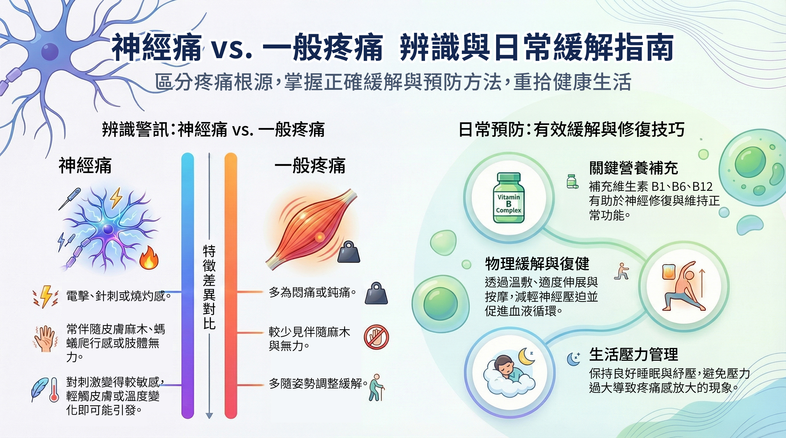 肌肉痠痛通常呈現悶痛或鈍痛感,且痛點明確、會隨姿勢改變而緩解;神經痛則多呈放射狀,疼痛會沿著神經分布的路徑傳導。此外,神經痛常伴隨麻木或自發性的放電感,這是肌肉發炎較少見的表現。