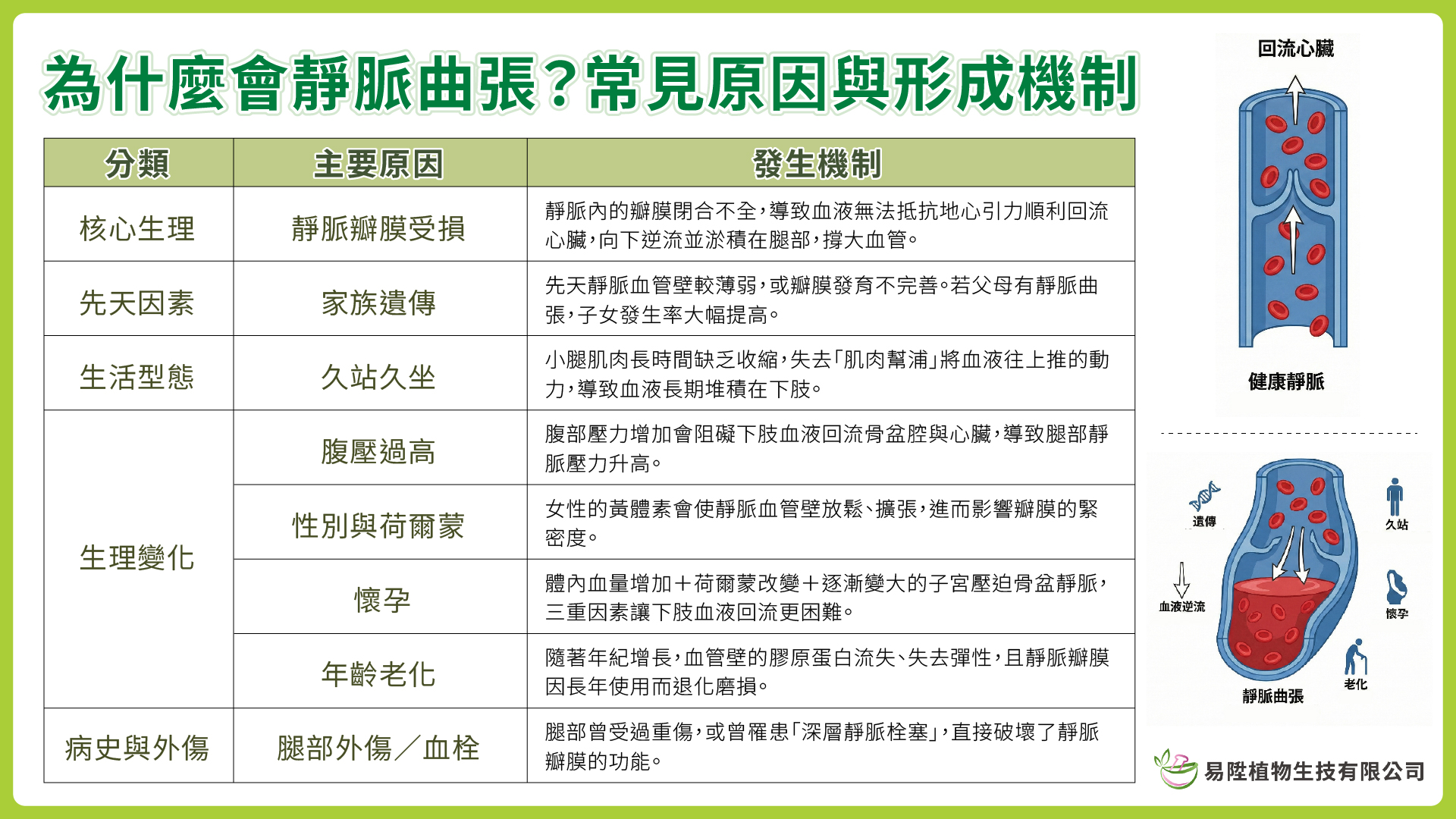 ▲靜脈曲張常見原因與形成機制。(圖/編輯室 製作)