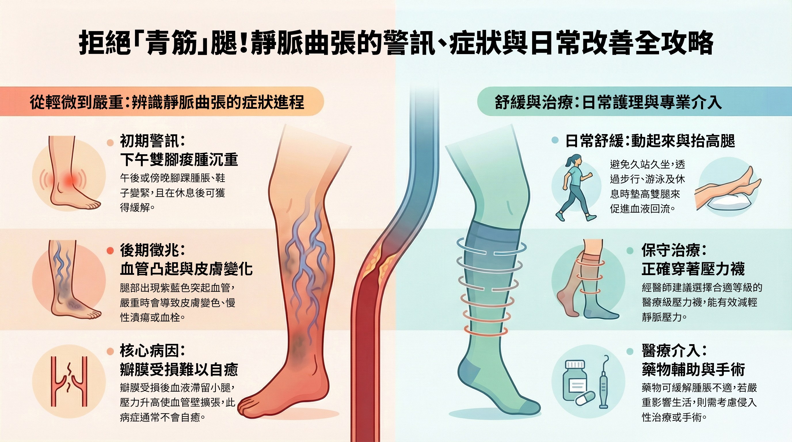 當腿部出現一條一條凸起的靜脈、青筋浮出,甚至整片腿看起來遍布密密麻麻血管時,很多人第一時間都會嚇一跳。其實,這樣的情形出現往往代表靜脈循環可能出現異常,臨床上最常見的診斷便是靜脈曲張。造成靜脈曲張原因,多半與經常久站久坐、遺傳、年齡增加、懷孕或體重過重有關。隨著病程發展,患者容易感到小腿痠痛、沉重感,甚至出現腳踝腫脹等不適症狀,嚴重影響日常生活。當民眾意識到自己出現這些靜脈曲張症狀時,難免會有「靜脈曲張會消失嗎?」、「靜脈曲張怎麼辦?」、「如何進行靜脈曲張改善?」等一連串的疑問,甚至希望透過靜脈曲張藥或靜脈曲張手術來改善。但實際治療策略仍需視病情嚴重程度,由醫師進行專業的評估與判斷。